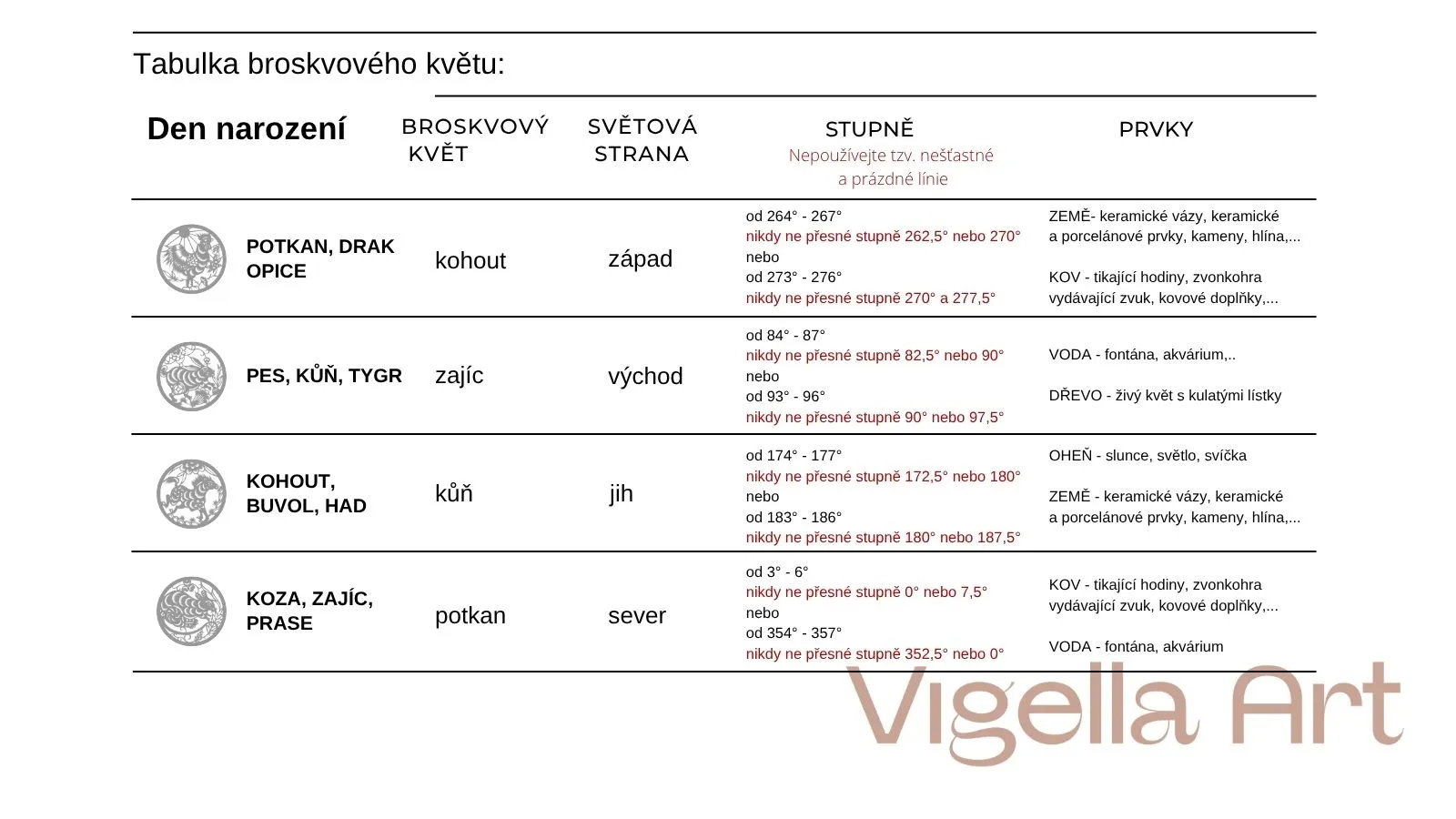 Využijte tabulku podle které si určíte místo ve svém bytě, či domě k umístění symbolu pro získání lásky a přitažlivosti. Použíjte nejvhodnější prvek dřevo – živá květina s kulatými lístky. Vaše znamení v den narození má tzv. hvězdu broskvového květu v znamení, které je spojeno se světovou stranou, kde se má umístit živá květina (tabulka). Pozor, ne na střed této světové strany, jde o tzv. mrtvé body, ale o pár stupňů na jednu nebo druhou stranu. Například: potkan je spojen se světovou stranu západ, který je přesně na 270 stupních na kompase. Postačí květinu posunout na 265 nebo 275 stupňů. To platí u každé světové strany. Pokud se tento směr nachází na toaletě nebo v kuchyni, najděte si tento směr ve své ložnici.