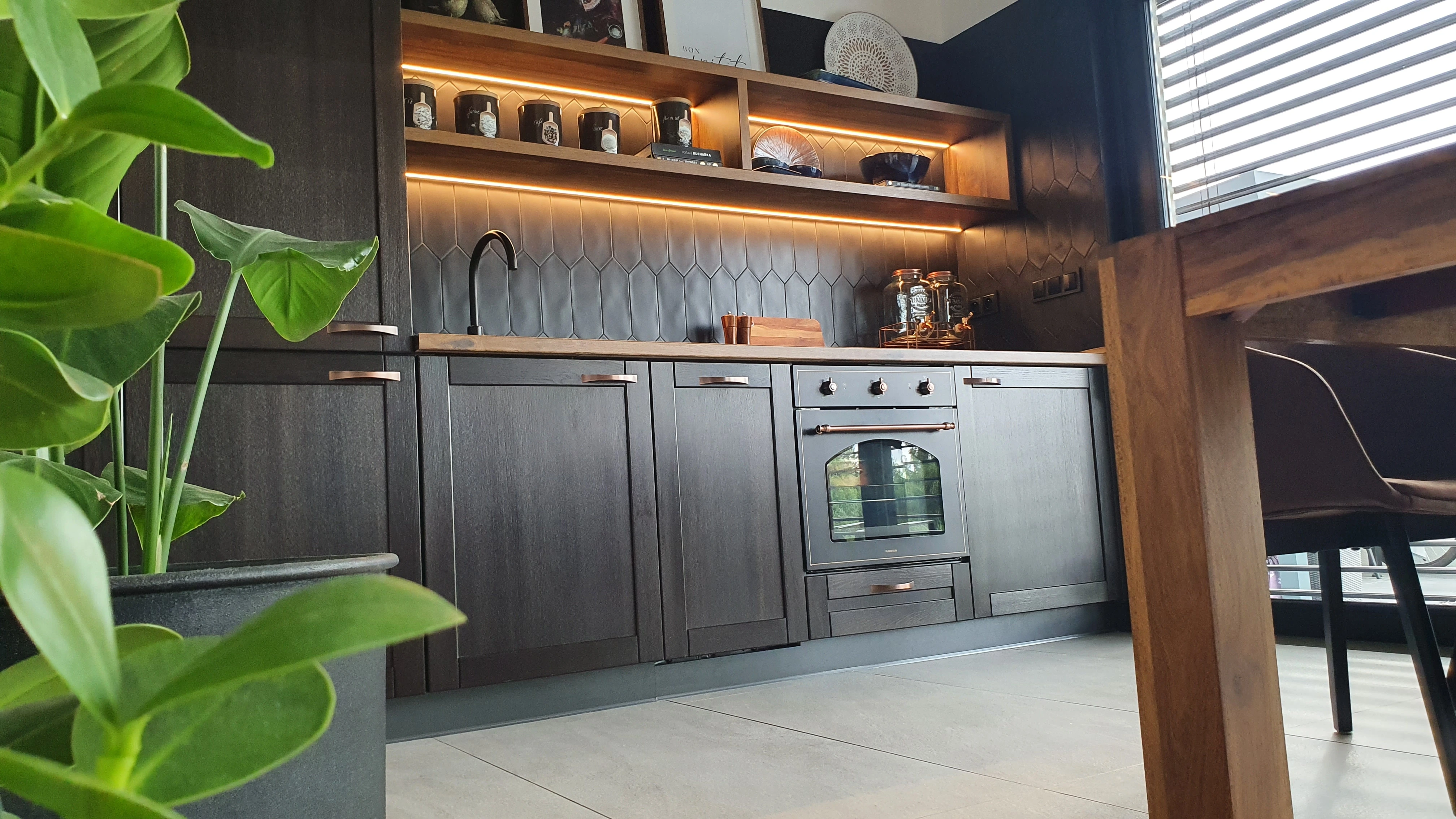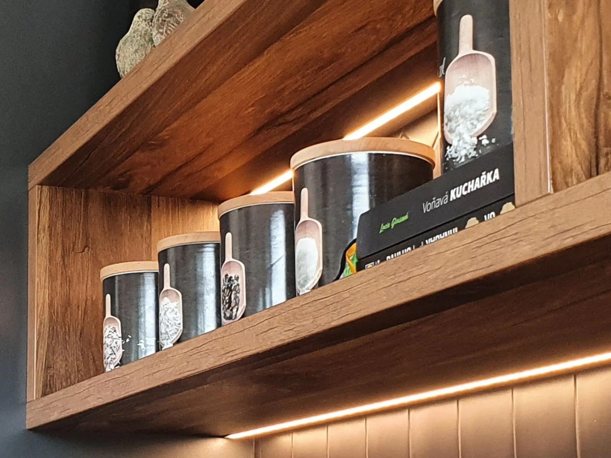 Otevřené police s jemným osvětlením a pečlivě vybranými doplňky spojují krásu s funkčností.