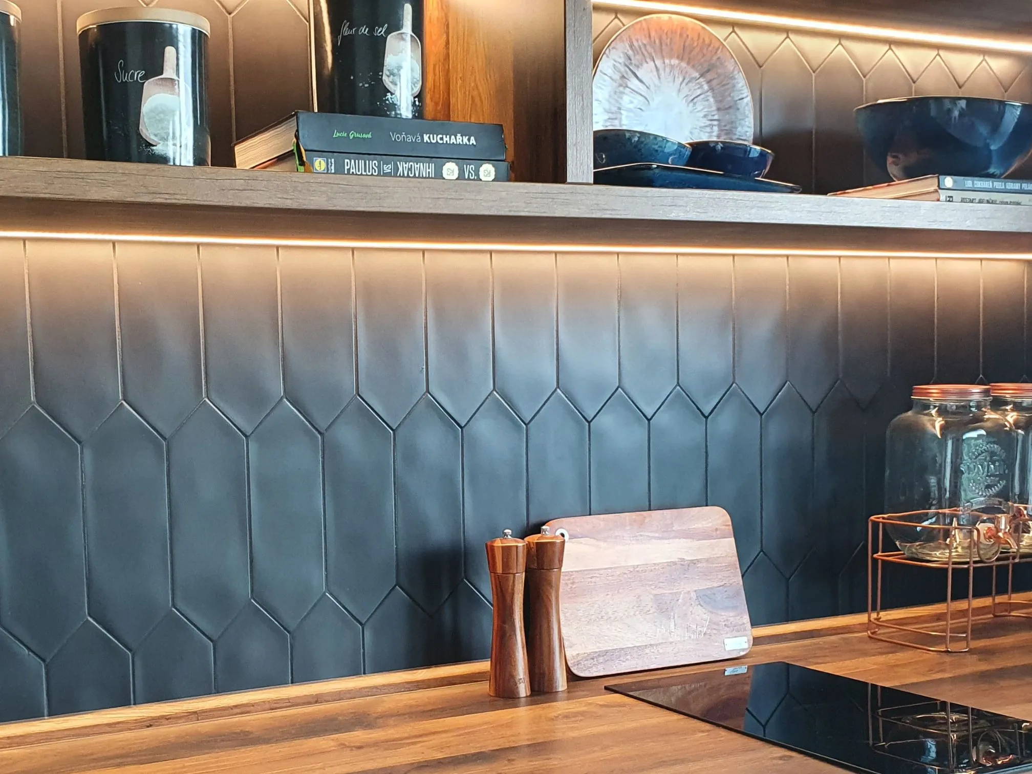 Tmavé dřevo, teplé světlo a přirozené linie vytvářejí prostor, který působí elegantně i útulně.