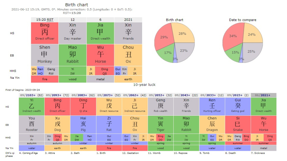 Doporučuji poradenství: BAZI základní výpočet elementů v době narození, z něhož můžeme přesně určit nejen kvantitu, ale i kvalitu 5 prvků. Jako příklad uvedu klienta, který má v základním tabulce bazi 65% prvku země, takže je zřejmé, že když budeme přidávat prvky země, že rovnováhu pravděpodobně nenajde. Neváhejte a vyzkoušejte poradenství barev a prvků podle data narození. Pojďme společně najít vaši rovnováhu.