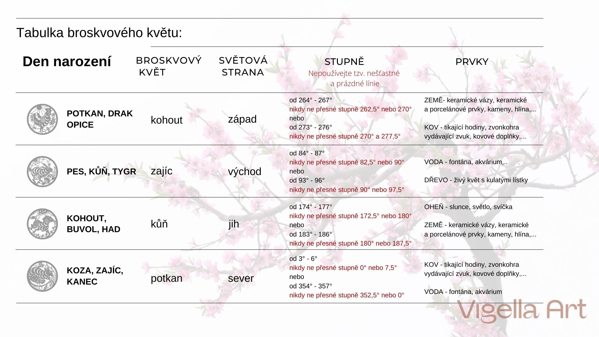 Využijte tabulku podle které si určíte místo ve svém bytě, či domě k umístění symbolu pro získání lásky a přitažlivosti. Použíjte nejvhodnější prvek dřevo – živá květina s kulatými lístky. Vaše znamení v den narození má tzv. hvězdu broskvového květu v znamení, které je spojeno se světovou stranou, kde se má umístit živá květina (tabulka). Pozor, ne na střed této světové strany, jde o tzv. mrtvé body, ale o pár stupňů na jednu nebo druhou stranu. Například: potkan je spojen se světovou stranu západ, který je přesně na 270 stupních na kompase. Postačí květinu posunout na 265 nebo 275 stupňů. To platí u každé světové strany. Pokud se tento směr nachází na toaletě nebo v kuchyni, najděte si tento směr ve své ložnici.
